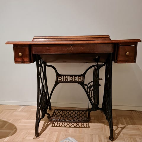 Kaunis Singer-pöytä pienellä ompelutarvikelaatikolla. Valkoinen maali kulunut pöytälevyn pinnasta.