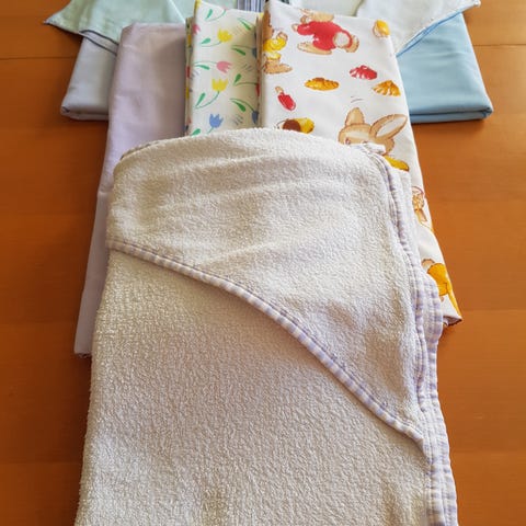 Setti hieman erikokoisia mutta pääasiassa vauvan tai taaperon pussilakanoita. Lisäksi yksi vaaleansininen aluslakana.