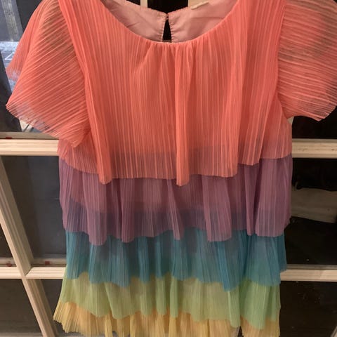 Myydään keltainen Ciraf sateenkaari -mekko koossa 122. Alaosassa monivärinen tylli keltaisen mekkokankaan päällä. Takana nappikiinnitys. Vyötäröllä hopeinen kuminauha erottamassa ylä-ja alaosaa. Yläosassa hieman pesunukkaa, mutta yleisilme on siisti. Sateenkaari printti on siisti ja ehjä.