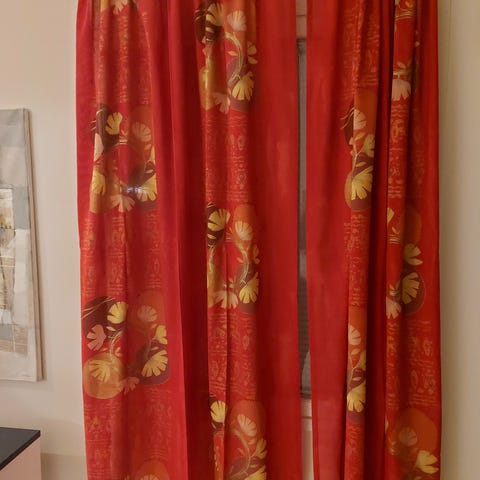 Vaaleat verhot kulta/ruskeilla kuvioilla ja purjerenkailla ripustamista varten. Ostettu Intiasta. 3kpl