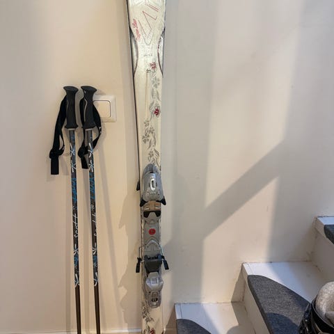 Myydään laskettelupaketti. Sukset 163, sauvat 125 ja monot 43 (pohjassa 26).