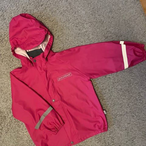 Kuvan sadetakki, jossa tikkivuori. En löytänyt takista moitteita. Merkki Jonathan. Vetoketju vähän jähmeästi toimii.