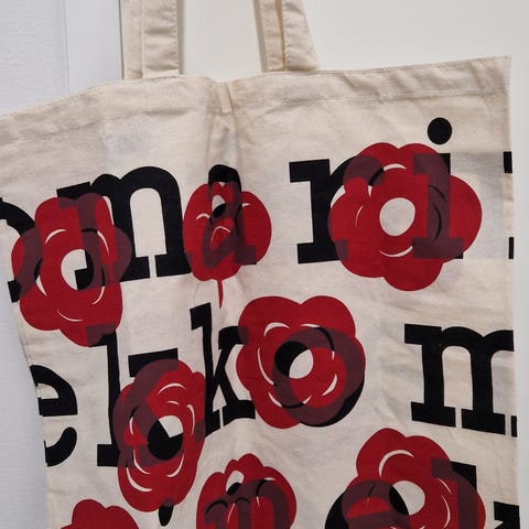 Marimekko kangaskassi, jossa oranssinpunaiset kukkakuvioinnit ja mustat kirjainpainatukset. Kangasmateriaali tekee kassista kestävän ja uudelleenkäytettävän. Sopii arkipäiväiseen käyttöön ja ostoskassiksi.