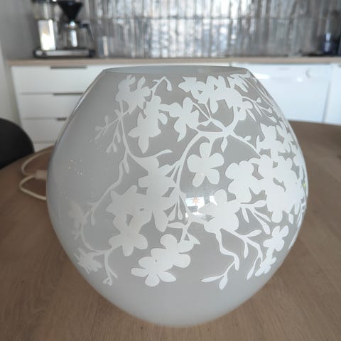 Savun värinen lasinen Ikean Fado-pöytävalaisin. Pinnassa paikoittain pieniä naarmuja (eivät juurikaan näy kun lamppu on pois päältä), huomioitu hinnassa. Toimii moitteettomasti. Lamppu ei kuulu kauppaan.