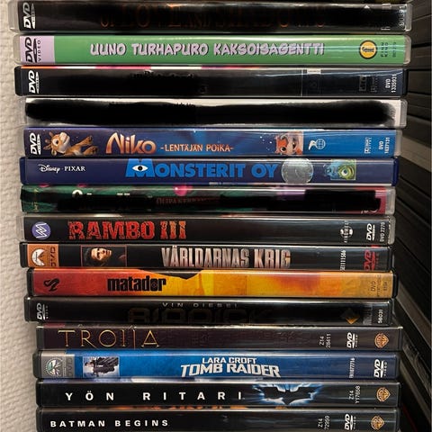 Myydään 10kpl elokuvia. Mukana elokuvat: 300, Jurassic Park 1-3, Spider Man 3, Doom, Matka maan keskipisteeseen, Watchmen, Secuestro Express, Veteen piirretty viiva, Yön ritari ja 24 hours. Hinta yhteensä 7€.