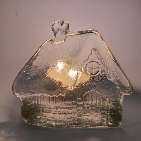 lasinen talo-aiheinen kynttilänjalka, joka on valmistettu kirkkaasta ja huurretusta lasista.