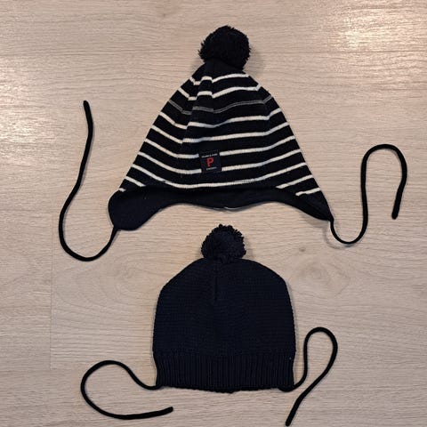 2 isompaa puuvillapipoa (9-12 v) ja oranssi raitapipo (2-6 v). Kaikkia pidetty, siistissä käytetyssä kunnossa. Yhteishinta.