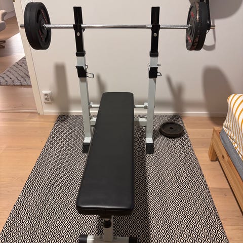 Myydään penkki punnerrus penkki+ hauis penkki+ levytanko ( pituus 1.82 sm, 25 mm halkaisija) + 102.5 kg levyjä.