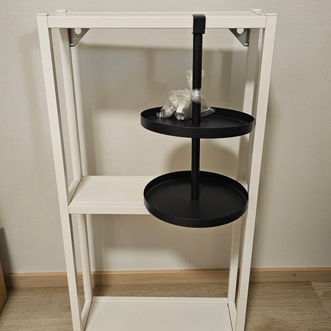 Hyväkuntoinen Ikean metallinen hylly jossa puinen päällysosa. Vain nouto ja käteismaksu.