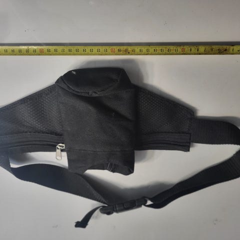 Väri sininen/pinkki. Sauvoille remmit, numerolapulle nepparikiinnittykset. Geeleille jne kätevästi tilaa.
