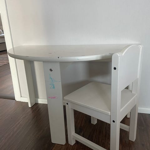 Ikean lasten tuolit ja pöytä, muuten hyvässä kunnossa mutta pöydän kannessa jälki, toisessa penkin jalassa koiran pienet hampaan jäljet 😄