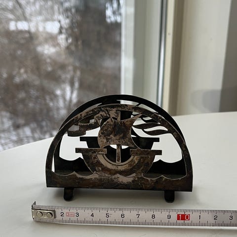 Servettiteline lautasliinateline teline hopeinen hopea metalli kromi chrome messinki vintage sisustus