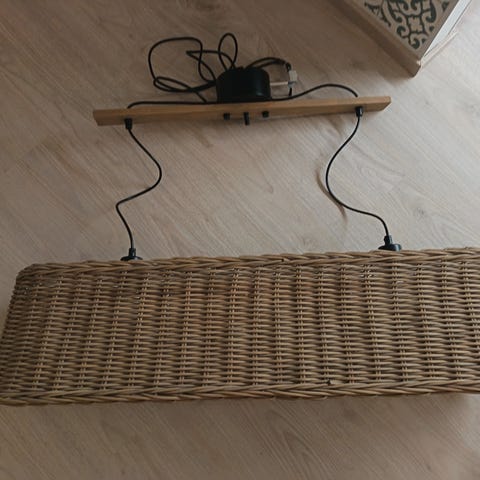 Myydään rottinkinen kattovalaisin. Lampussa pitkä johto, 2m jonka avulla korkeutta voi säädellä.