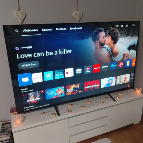 TV-sovelluksissa mm: Netflix, YouTube, Yle Areena, Ruutu, mtv, Viaplay, Spotify Music, CMore, Amazon Prime Video, Google Play Movies, SF Anytime, Blockbuster Nordic, Deezer, HBO Max