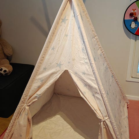 Koottava lasten leikkiteltta. Ollut sisäkäytössä. Hyväkuntoinen, kevyt, ei vie paljon tilaa.