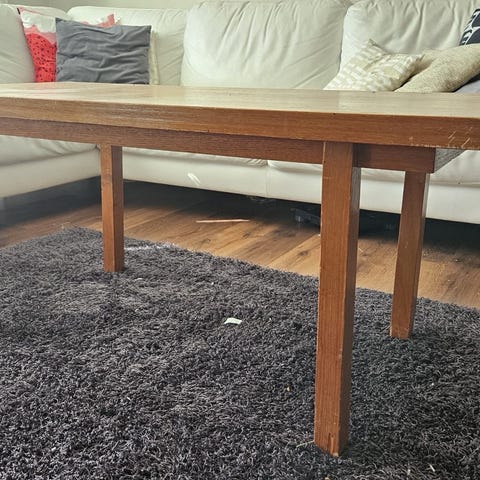Kansi ja etulevyt vissiin tiikkiviilua tai vastaavaa. Rungot maalattu valkoiseksi. Pöytälevyssä iän mukaista patinaa, näkyy kuvista.