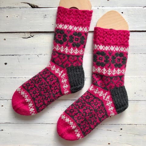 Käsinneulotut ohuet villasukat, jotka hyvin mahtuvat talvikenkiin, tennareihin, tossuihin yms. Vain yksi pari saatavilla. Vahvistettu kantapää. Lankana Drops Fabel ja Garn Raita (75% villa, 25% polyamidi). Konepesu 40°C.