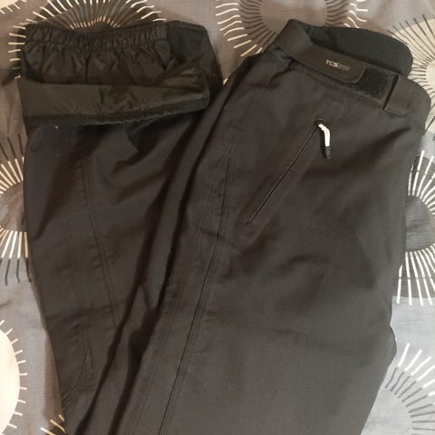 Myyntiin uutta vastaavat kuorihousut. Mustat. Vetoketju ja nappi vyötäröllä sekä kuminauhakiristystä. Vetoketjutaskut sivuilla.
