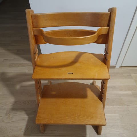 Vapautettu uudelleen myyntiin ohareiden vuoksi. Stokke Syöttötuoli valmistettu puusta. Lasten syöttötuoli, jossa säädettävät istuin- ja jalkatuet. Sopii eri-ikäisille lapsille.