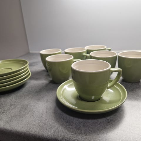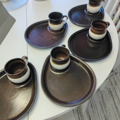 Myydään kermansavi astiastoa. Yhdessä kahvikupissa lukee nimi, muut nimettömiä. Hyväkuntosia. Hinta 10e.