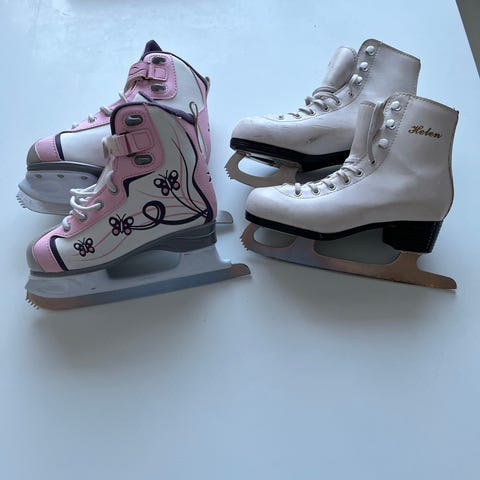 Lasten luistimet, koko 32, valkoinen väri. Luistimissa pehmeä vuori ja koristeena lumihiutalemaisia kuvioita. Soveltuvat lasten luisteluun. Kohtuu siistit
