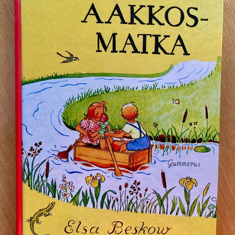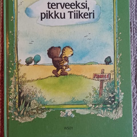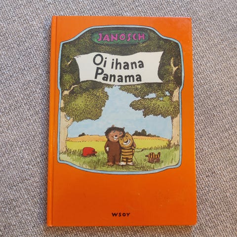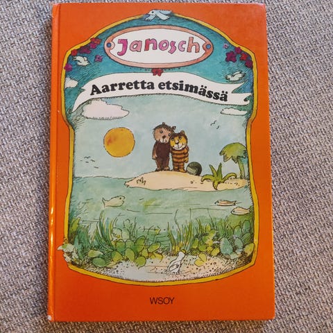 Janoschin lastenkirja Postia tiikerille, ensimmäinen painos (1982). Kirja on oikein siistikuntoinen. Ensimmäisellä aukeamalla melko huomaamaton nimikointi, siitä kuva.