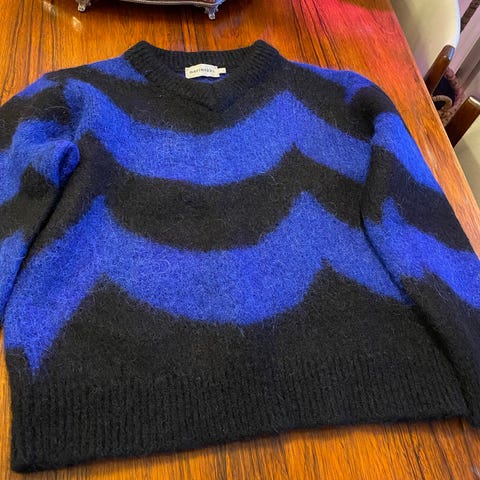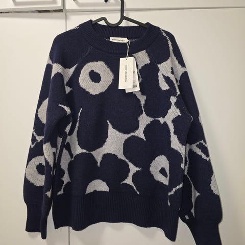Marimekon raidallinen villapaita naisten L-koko. Väri burgundi-vanilja. 100% villa.