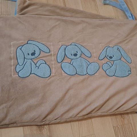 Pinnasängyn reunapehmuste ja peitto, molemmat vanutettu.