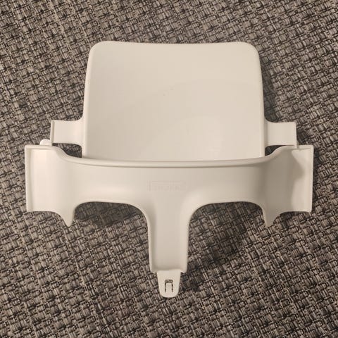 Stokke Tripp Trapp syöttötuoli, jossa on valkoinen runko ja musta Baby Set.