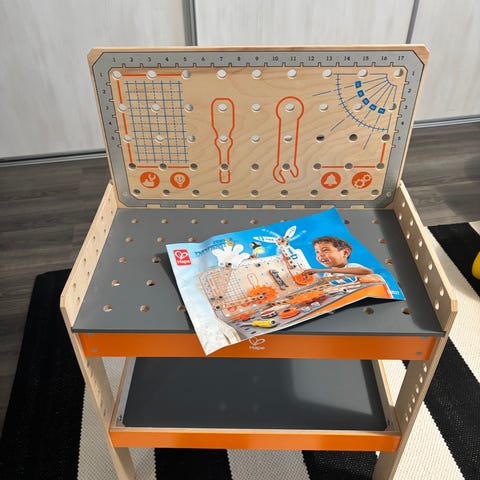 Hapen junior inventor työpöytä, jossa on useita osia (puisia ja muovisia). Työpöytä sisältää rei'itetyn pinnan sekä työkaluja osien kiinnittämiseen. Sopii lasten leikkeihin kehittäen luovuutta ja hienomotorisia taitoja. Hyvässä käytetyssä kunnossa seuraaville leikkijöille.