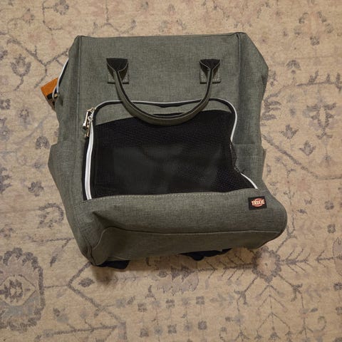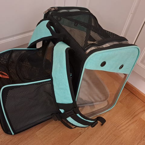 Todella kätevä reppu isonkin kissan tai pienen koiran kantamiseen. Avautuu 3 eri kokoon. Täysin avatussa repussa mahtuu nukkumaan selkä suorana ja peruskoossa pieni istumaan. Vie vain hyvin pienen säilytystilan.