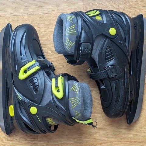 Todella hyväkuntoiset helposti säädettävät luistimet joissa helppoköyttöiset kiristimet, koko säätyy 33-36.
