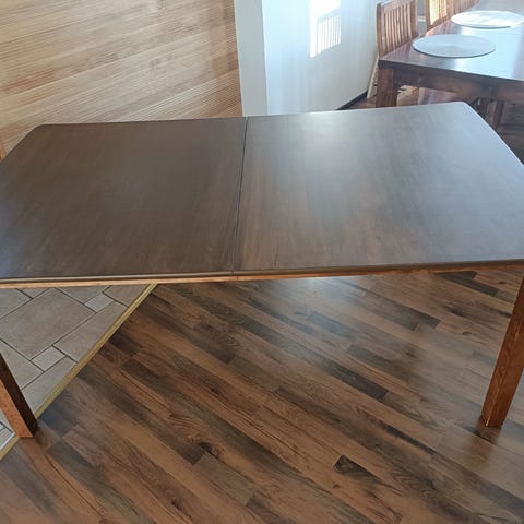 Tukeva ruokapöytä, pinnasta kulunut mutta kevyellä hionnalla ja lakalla saa uudenveroiseksi. Keskiosalta hieman taipunut jatkoskohdan kohdalta, josta pöytä jatkettavissa jatkopalalla. Leveys 90cm, korkeus 74,5cm. Pituus 129,5cm ja jatkettuna 174,5cm
