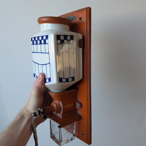 Harvinaisuus! Vanha suomalainen kahvimylly. Posliiniosa on Arabian.Se irtoaa takalevystä, samoin kuin lasiosa, johon jauhettu kahvi kerääntyy. Korkista puuttuu paloja, mikä näkyy kuvassa. Toimiva tuote.