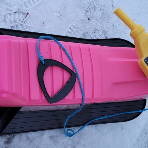 Lumirattikelkka. Toinen suksi kärjestä poikki, mutta ei haittaa mäenlaskua.