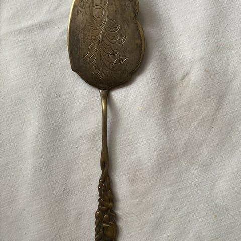 Koristeellinen vintage kakkulapio. Metalliosa kullan värinen, mahdollisesti messinkiä. Kahvaosa on todennäköisesti bakeliittiä. Kahvan pinta on krakeloitunut ajan myötä. Edelleen kuitenkin käyttökuntoinen ja kaunis.