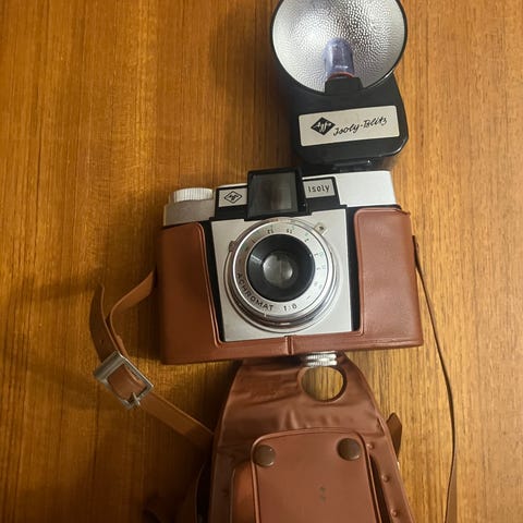 Agfa kamera ruskeassa suojakotelossa. Kamera on metallinen ja mukana tulee ruskea suojakotelo, joka suojaa laitetta käytön aikana ja kuljetuksessa. En ole kokeillut toimiiko kamera, mutta saattaa hyvin toimiakin oikeilla varusteilla ja jos käyttäjä tietää kameroista jotakin.
