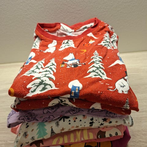 Myydään pakettina kolme tyttöjen paljon käytettyä yöpaitaa, joista kaksi pitkähihaista ja yksi lyhythihainen. Vain keskimmäisessä näkyvissä koko 120,muista koko lappu puuttuu, mutta olleet yhtäaikaa käytössä. Yöpaidasta tosiaan olleet kovalla käytöllä, mutta edelleen käyttökelpoiset ja ehjät seuraavalle lapselle.