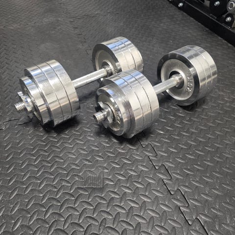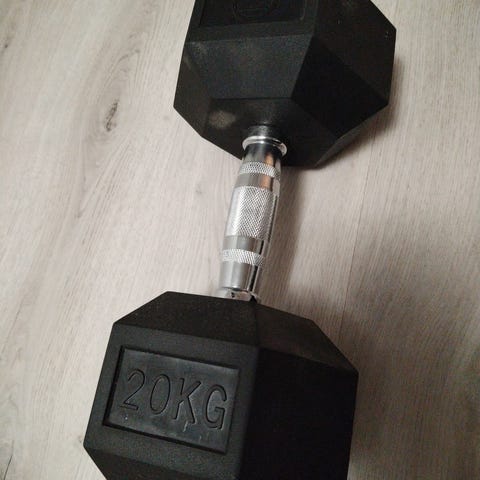 Gymstick säädettävät käsipainot. Setissä on kaksi käsipainoa, joiden paino on yhteensä 20 kg, levyt 4 x 1,25 kg ja 4 x 2,5 kg. Mukana muovinen kuljetuslaukku (40 x 24,5 x 10,5 cm).