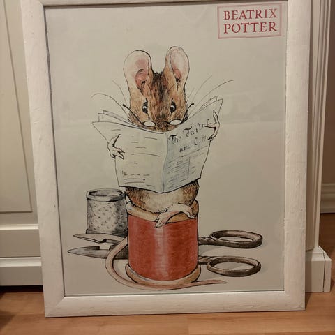 Beatrix Potterin hiirijulistetaulu. Kehykset on itse valkoiseksi maalattu. Ostettu 90-luvulla Anttilasta.