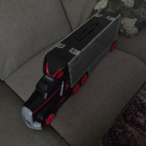 Pikkuautojen säilytys rekka jonka molemmat puolet aukeavat ja edessä on liukumäki.