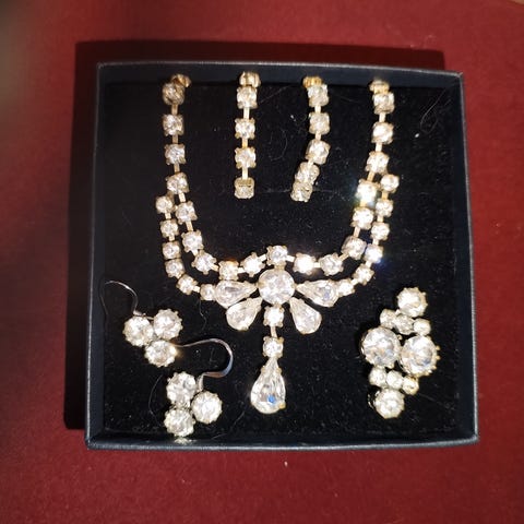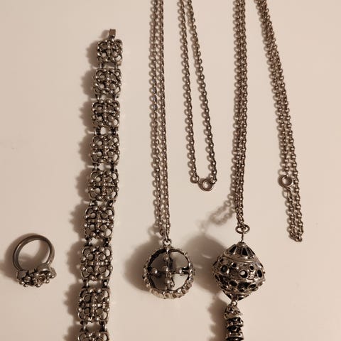 70-luvulta, ornatekuvioiset vintage tyyliset korut. Kaulaketjun pituus 62 cm, ranneketju 18 cm, korkeus 38 mm, sormus 18 mm. Olisko Tapio Vanhatalon suunnittelevia koruja?