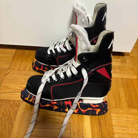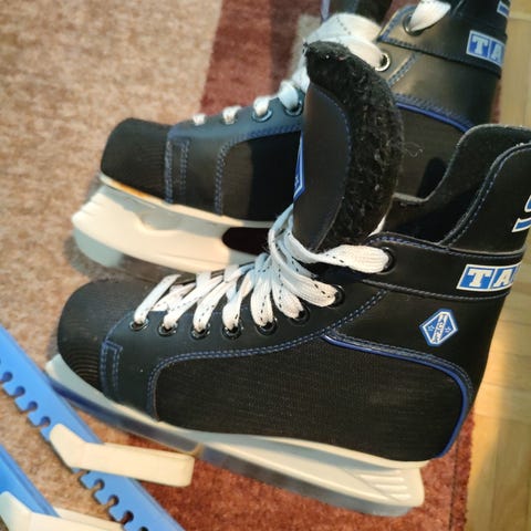 CCM hokkarit koko 36, leveämpi ee-lesti. Paljon käytönjälkiä, pahimmat ovat läpissä sivuissa olevat halkeamat pintamateriaalissa, läppien sisäpuoli kuitenkin ehjä, eli ei haittaa käyttöä. Terät tuntuvat teräviltä, mutta en tiedä täysin miten terävät pitää olla. Pohjallisen pituus noin 23,4 cm. Toisessa luistimessa ei alkuperäinen pohjallinen vaan joku hieman liian lyhyt pohjallinen. Vain nouto.