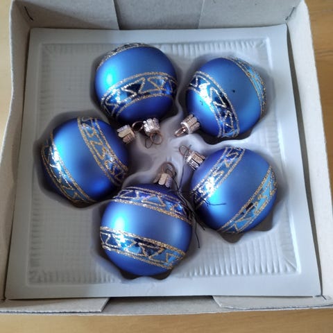 Hunajakenno-kuusenpallot 15 kpl. Kahta eri kokoa ja väriä, suurempia neljä kpl (halk. 10 cm) pienempiä 11 kpl (halk. 8 cm). Hyväkuntoisia, tosin parissa pallossa kennojen välit ovat hiukan laajentuneet (ks. harmaa iso pallo ensimmäisessä kuvassa). Materiaali tukevaa kartonkia. Sopivat joulukoristeeksi muuallekin kuin kuuseen. Kaikille on säilytyspussi tallella. MMM