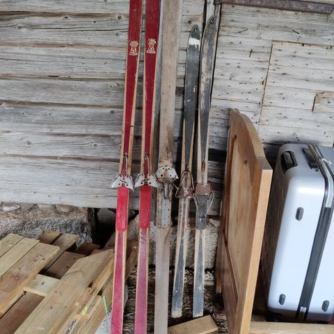 Perinteiset puurunkoiset maastohiihtosukset. Harjun Suksitehdas, omistaja “A. Valkonen”. Sukset ja sauvat ovat ikäänsä nähden siistit. Pala suomalaista talvihistoriaa.