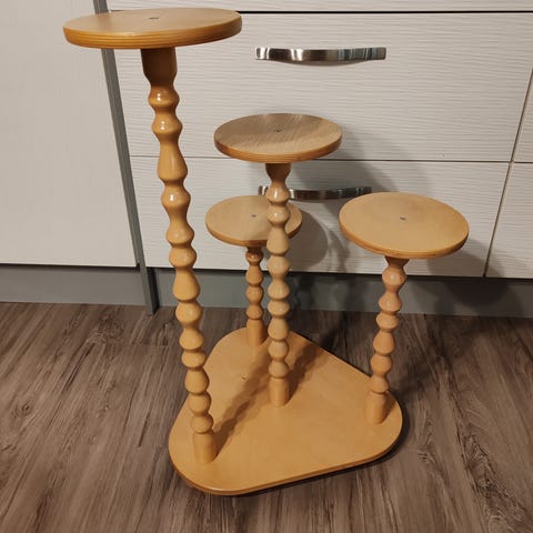 Uusi, vaalea kukkateline kolmelle kukalle. Korkein hylly lattiasta 72cm, keskimmäinen 59cm ja matalin 48cm. Alaosa tyylitelty kolmion mallinen.