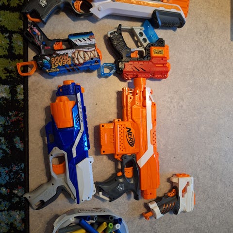Hyväkuntoisia nerf aseita 17kpl, 3x-shot asetta,ammuksia ja lisätarvikkeita. Mielellään kaikki kerralla.