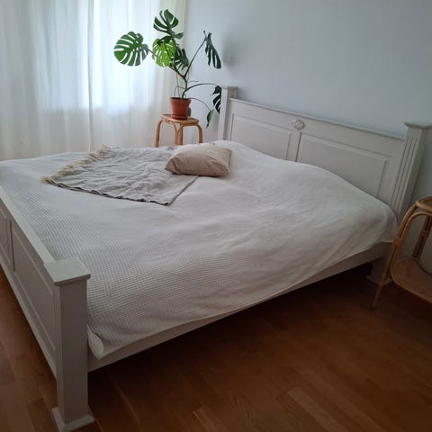Puusänky, johon mukaan kaksi 120x200cm patjaa. Sängyn korkeus patjojen kanssa 52 cm. Saa tarvittaessa purettua. Nouto 6.1. mennessä.