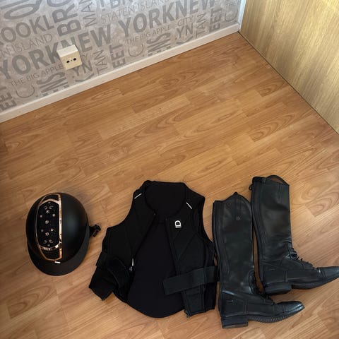 Beta 2000 ratsastussuojavarusteet sisältäen Harry’s horses suojaliivin ( level 3, koko L), kypärän koko 55, saappaat (koko 39), chapsit koko M ja raippa. Suojaliivi on valmistettu 80 % polyesteristä ja 20 % puuvillasta. Vähän käytetyt ja siistit! Myydään koko setti kerralla!