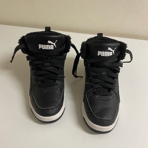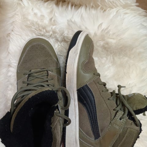 Nuorten Puma Rebound Rugged kengät, koko 37, unisex. Väriltään oliivinvihreät, valmistettu kestävästä synteettisestä materiaalista. Koripallovaikutteinen malli on korkeavartinen ja kengät ovat melko lämpimät.